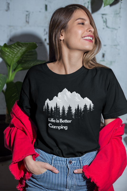 Size Large Cotton T Shirt Life is Better Camping Graphic Design Black T for Outdoor Camping Enthusiasts Womenswear Top