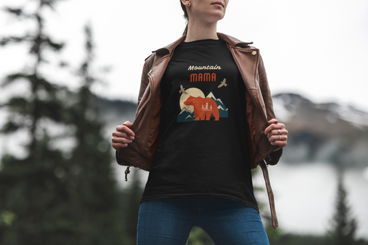 Mountain Mama Camping Graphic Black Cotton Summer Crewneck T Shirt for Women